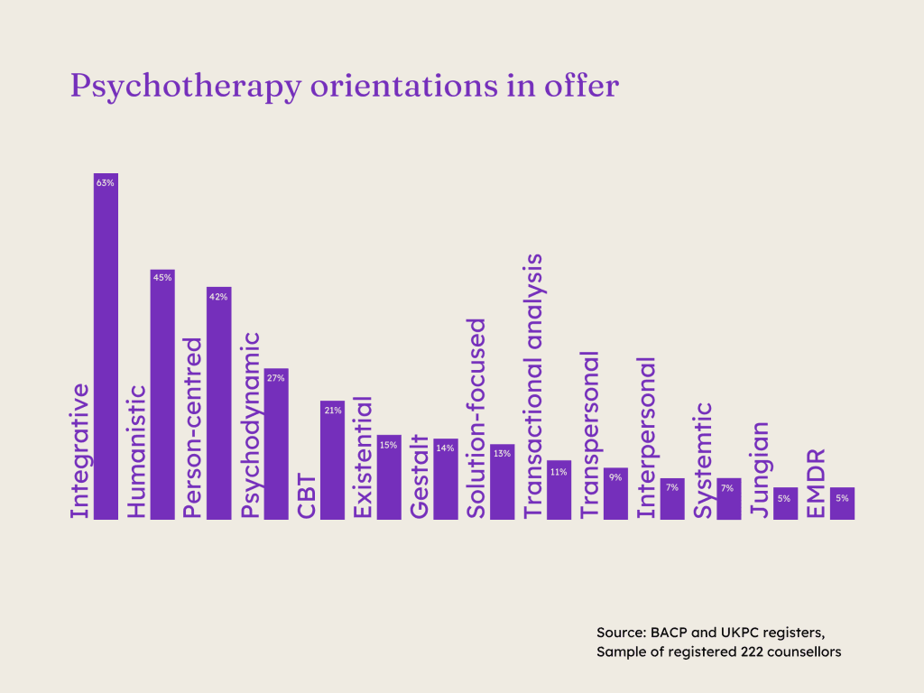 Integrative – where a therapist draws from different approaches blending person-centred, cognitive and psychodynamic –  is the most popular therapeutic approach.